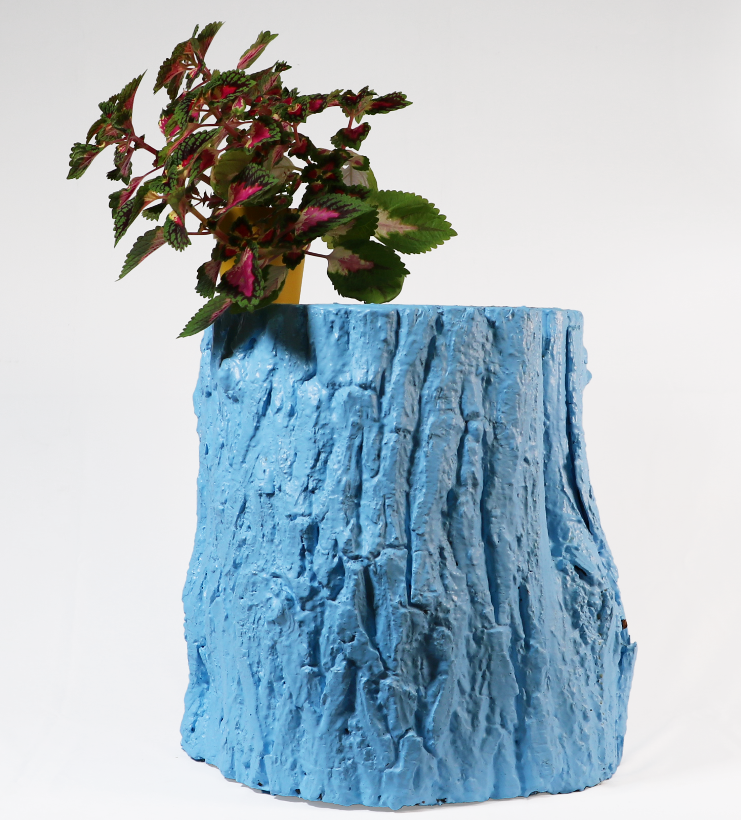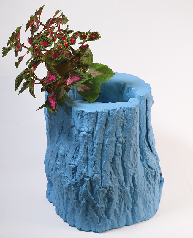 A little side table made from part of a tree trunk and polyester.